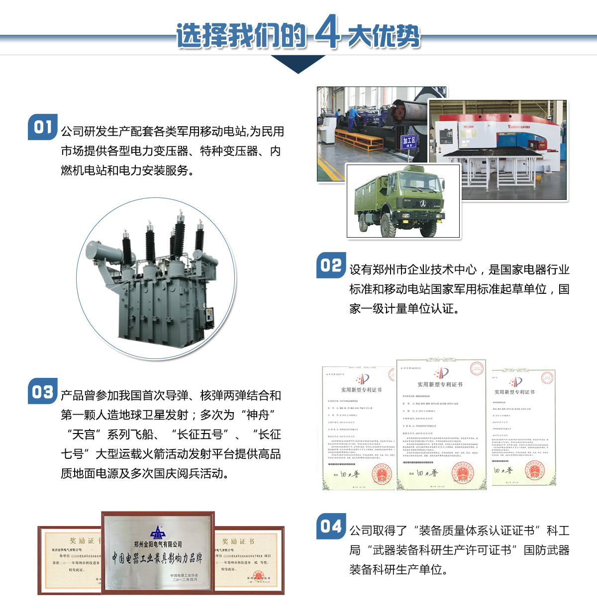 鄭州金陽電氣有限公司是由鄭州市國資委控股的國有獨資企業(yè),是原機械工業(yè)部在上世紀(jì)五十年代投資建立的移動電站和電力變壓器生產(chǎn)企業(yè)。公司下設(shè)電站公司和變壓器公司及其它配套公司,長期以來在國內(nèi)移動電站和電力變壓器行業(yè)占有重要位置。是河南省具備設(shè)計生產(chǎn)110kV電壓等級以上電力變壓器資質(zhì)的企業(yè),是國家經(jīng)貿(mào)委首批推薦城鄉(xiāng)電網(wǎng)建設(shè)與改造所需變壓器的生產(chǎn)企業(yè)。河南省變壓器檢測中心設(shè)在我公司。